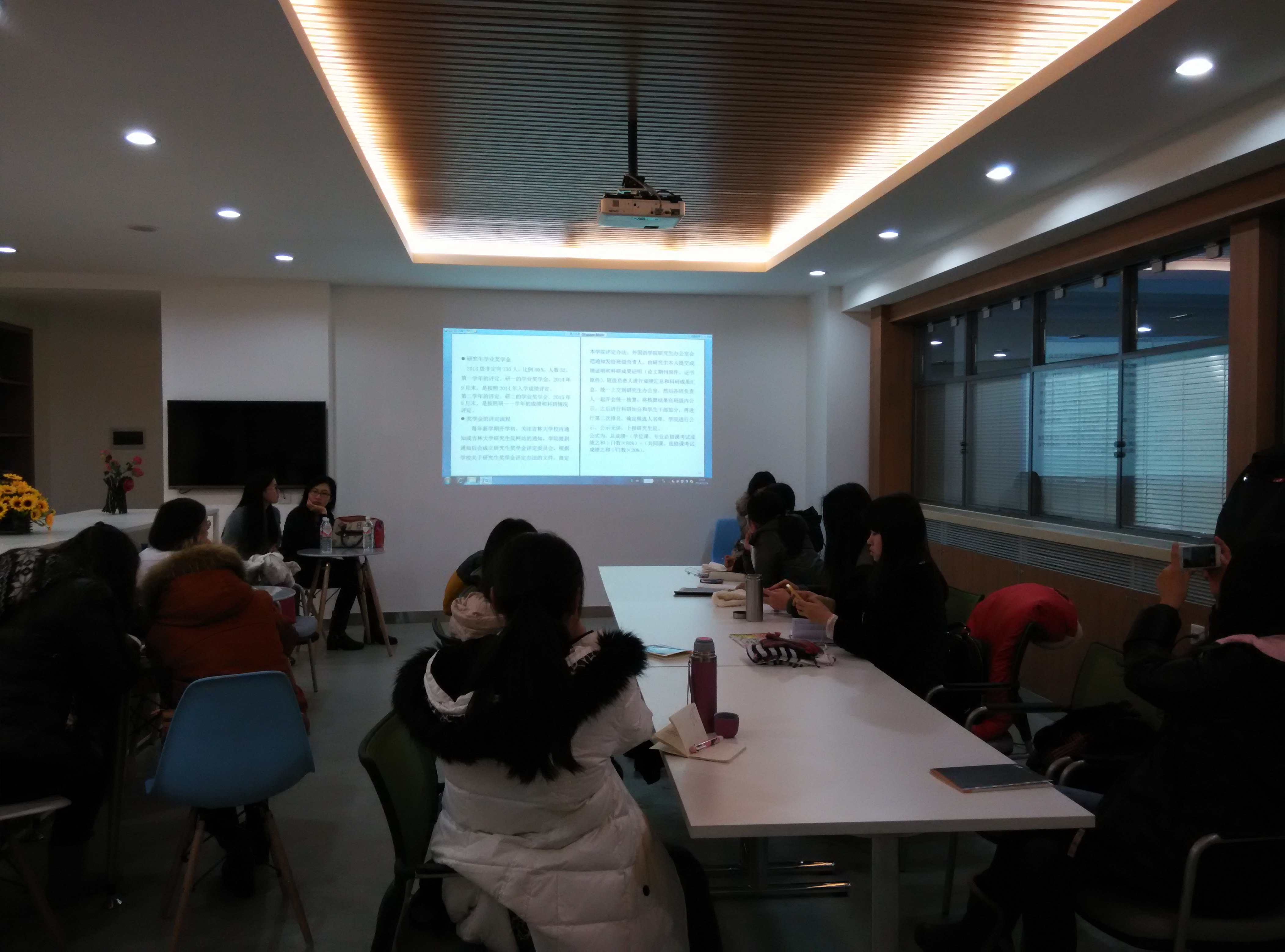交流会上, 2012级王紫嫣同学向大家详细介绍了研究生基本奖学金、学业奖学金及优秀奖学金评审细则。随后,2012级赵洺同学和刘帅同学为同学们介绍了学院研究生国家奖学金的评审细则,尤其详细介绍了国家奖学金评审工作中对学术成果的具体要求。三位同学鼓励参加交流的一年级同学,要加强对学术研究、科研创新的重视,从现在起便脚踏实地,一步一步地积累尝试,便会发现学术研究其实并没有自己之前想象中的那么难。赵洺同学还送给学弟学妹们一句话“金鳞岂是池中物,一遇风云便化龙”,鼓励大家相信自己。
