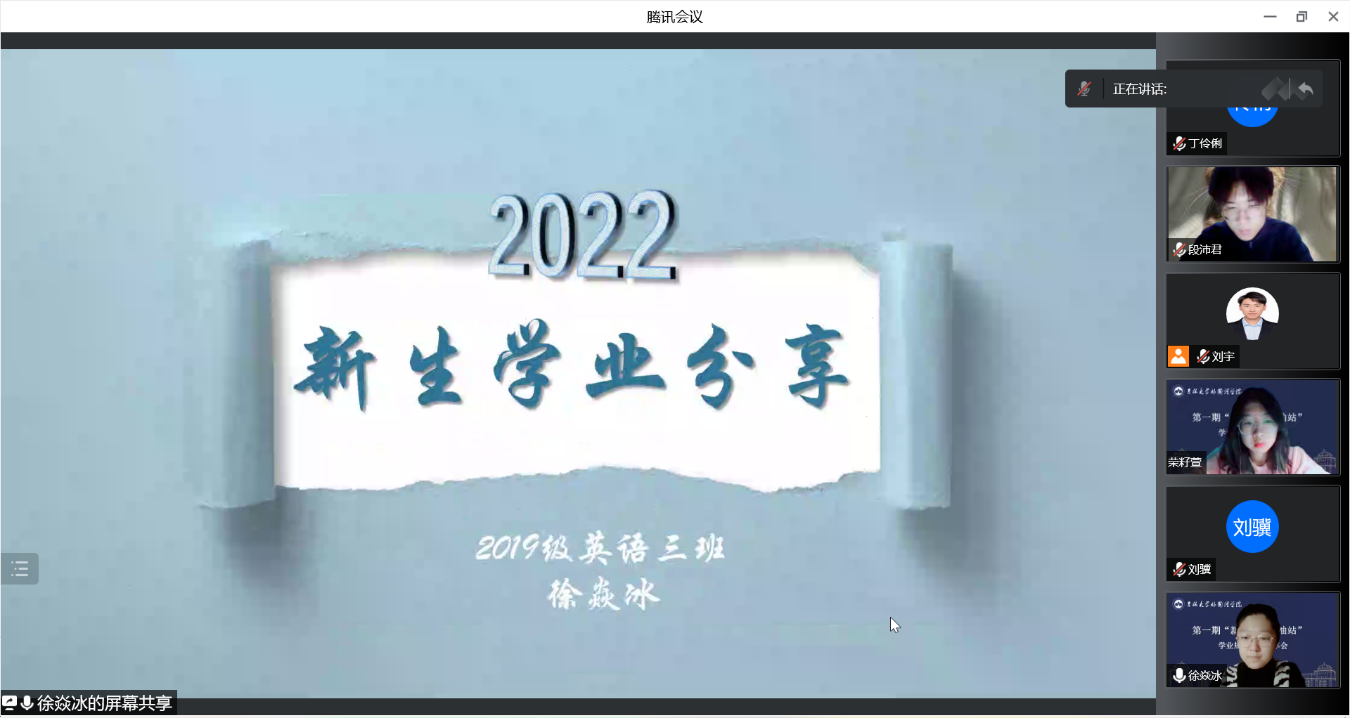 2020级英文系刘骥同学主持,2019级英文系徐焱冰、2019级俄文系马静、2019级日文系李锐、2019级西文系徐政奇、2019级朝文系李涵做学习经验分享。2022级学生辅导员刘宇老师、学院2022级新生参加。