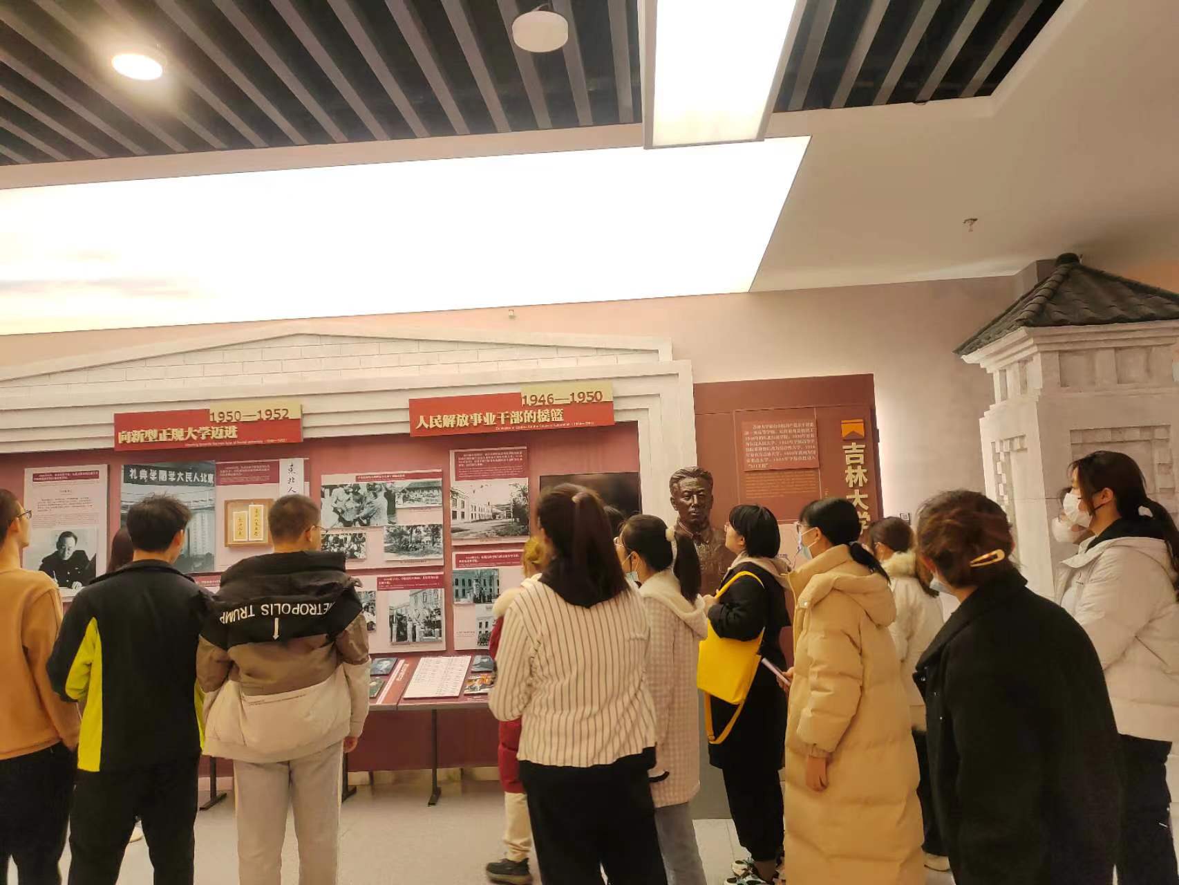 的校徽和校训为开篇,馆内设有杏坛翘楚、光辉岁月、继往开来、星光璀璨等十余个展区。参观过程中,同学们认真倾听讲解员的讲解,深切体会学校厚重的历史积淀、丰硕的办学成果和奋发的进取精神。最后同学们在校史馆门口合影留念。