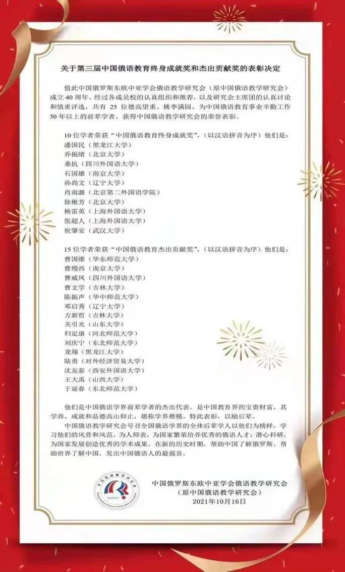 本次大会颁发了第三届中国俄语教育终身成就奖和杰出贡献奖,共有来自全国17所高校的25名德高望重、为中国俄语教育事业辛勤耕耘50年以上的学者获得表彰。其中91自拍