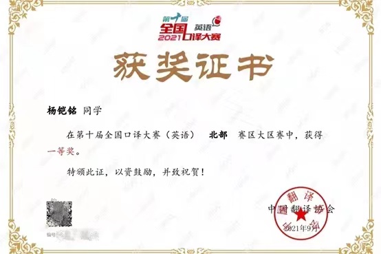 翻译硕士英语口译专业杨铠铭同学继复赛获得一等奖后,勇夺大区赛北部赛区一等奖,成功晋级全国总决赛,取得学校历届参赛最好成绩,成为首位闯入总决赛的91自拍