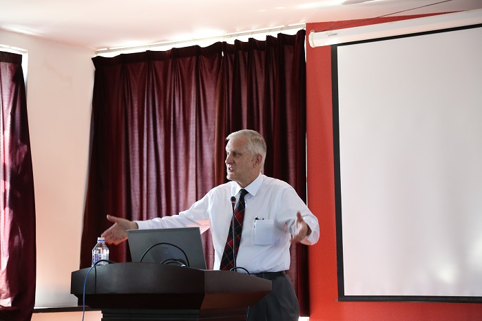 同一天,萨克雷教授为我校师生做了题为“English: Present and Past, What is Good English?”的学术讲座。在讲座中,萨克雷教授阐释了英语在漫长的历史更迭中在发音、词汇、语法等方面发生的变化,论述了语言变化的必然性。他认为语言的变化没有好与坏的分别,也不能简单地定义为是堕落还是进化,恰当地使用语言才是人文学科学生的重要功课。萨克雷教授学养深厚,在讲座中旁征博引,其风趣幽默的演讲风格引得师生阵阵掌声。此次学术讲座对我校广大师生提升人文素养、开拓学术视野、提高科研水平具有重要意义。