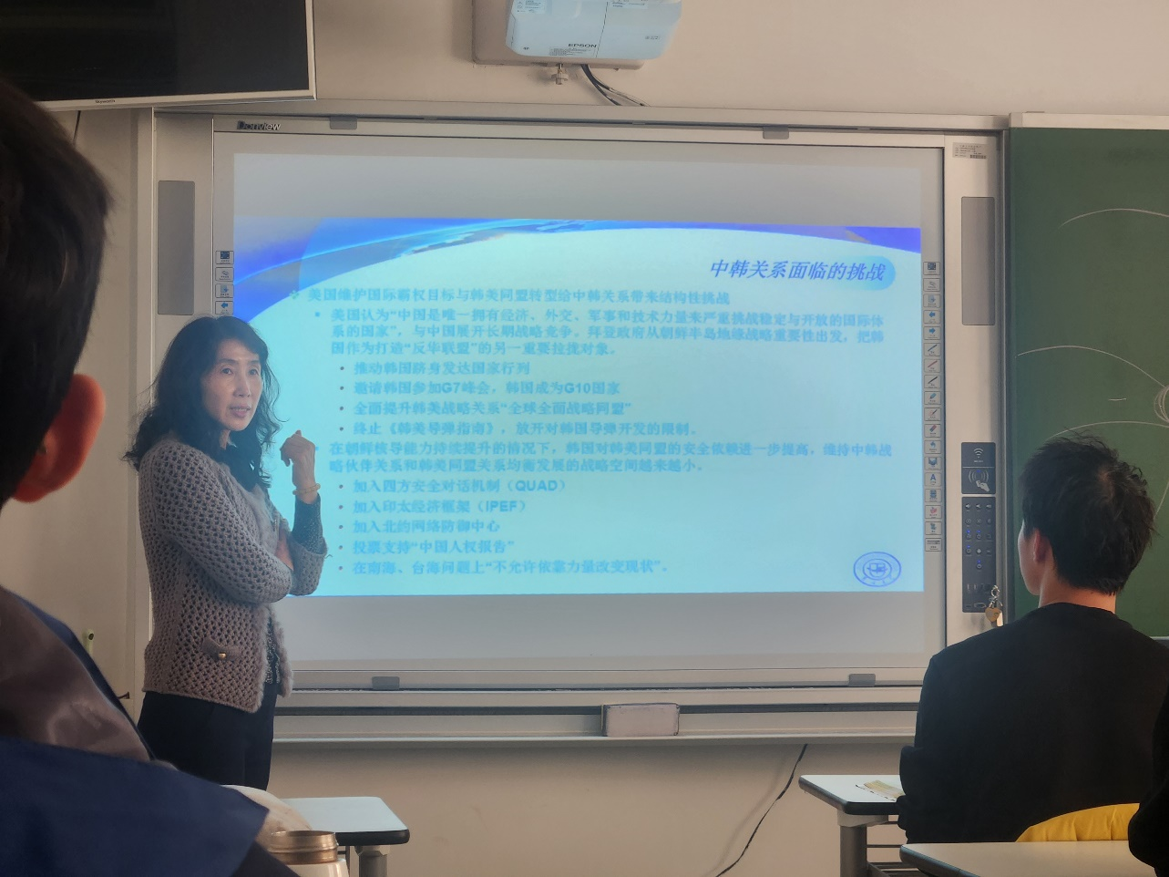 接下来,张教授对韩国对半岛形势的影响进行了分析。张教授从韩国新政府的外交政策入手,分析韩国近期对中、美、日、朝的态度以及政策上的转变,讲解韩国的外交政策是如何转变的。同时张教授也从多方面阐述了中韩关系在现阶段面临的各种挑战。通过这些分析,同学们对中韩关系有了进一步了解与认识。