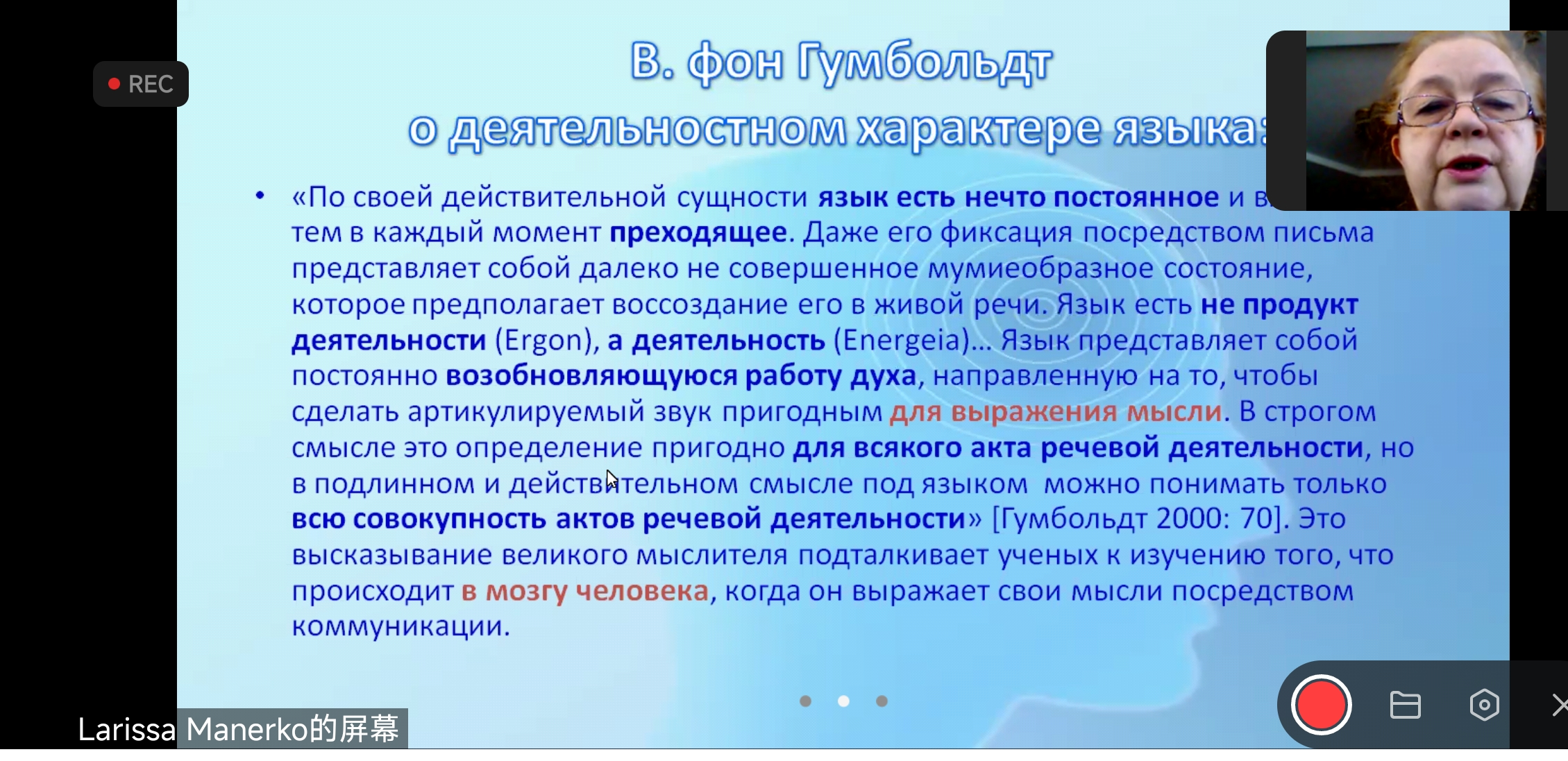俄文系邀请,2022年11月27日15时30至17时,莫斯科大学语言学博士拉丽萨·马涅尔科教授在云端通过ZOOM会议平台为我校师生做了一场主题为“心理语言学的发展特征”的学术讲座。马涅尔科教授现任莫斯科国立大学高翻学院教授、英语理论和实践教研室主任,主要研究方向为语言学的历史与方法论、语言分析方法、认知语言学、英语理论与历史、外语教育等,由于在术语学方面的成就,马涅尔科教授于2007年荣获联合国教科文组织Eugen Wuster奖。