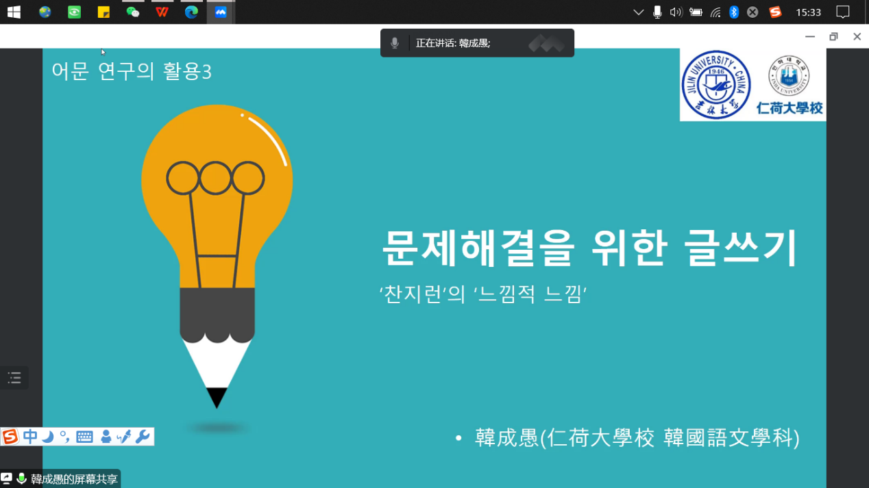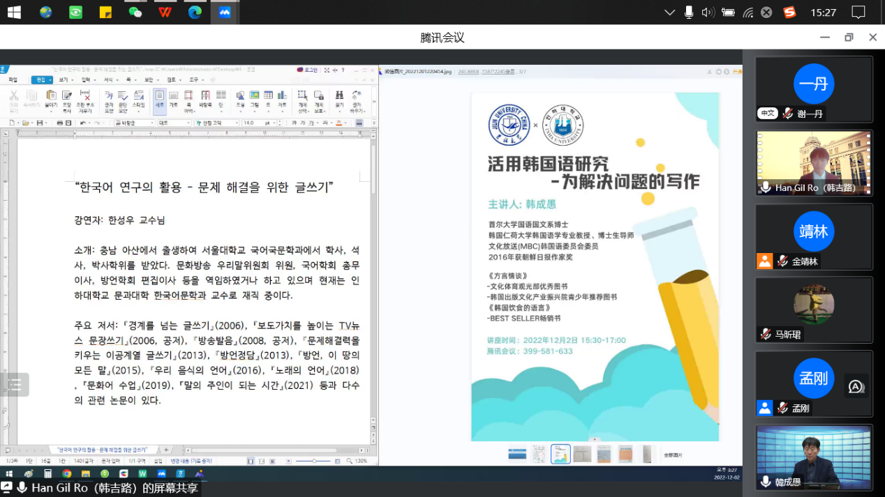 邀请,2022年12月2日15时30分,首尔大学国语国文系博士、韩国仁荷大学韩国语学专业教授、博士生导师、文化放送(MBC)韩国语委员会委员、2016年朝鲜日报作家奖获得者韩成愚老师在云端通过腾讯会议平台做了一场主题为“活用韩国语研究——为解决问题的写作”的学术讲座,讲座由朝文系外教韩吉路老师主持,参加讲座的人员有91自拍