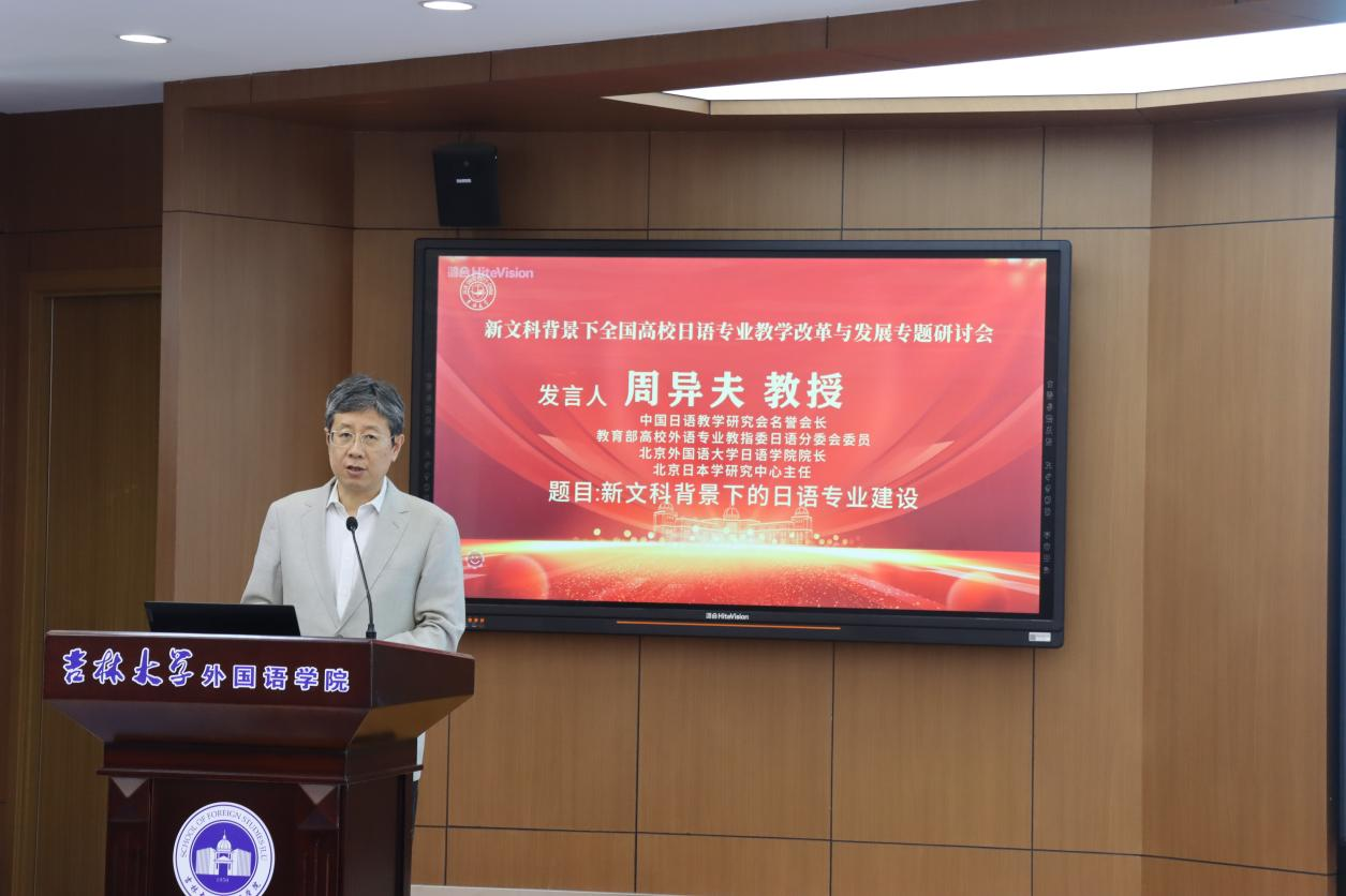 副院长房颖副教授主持。天津外国语大学修刚教授,教育部高等学校外国语言文学类专业教学指导委员会日语分委会委员、中国日语教学研究会名誉会长、北京外国语大学日语学院院长、北京日本学研究中心主任周异夫教授、广东外语外贸大学陈多友教授分别做了基调演讲。三位专家针对“新文科”背景下中国日语教育的内涵型发展、专业建设及新形势与新任务等问题,既解读了宏观的顶层设计理念,也提出了可落地的具体解决路径。