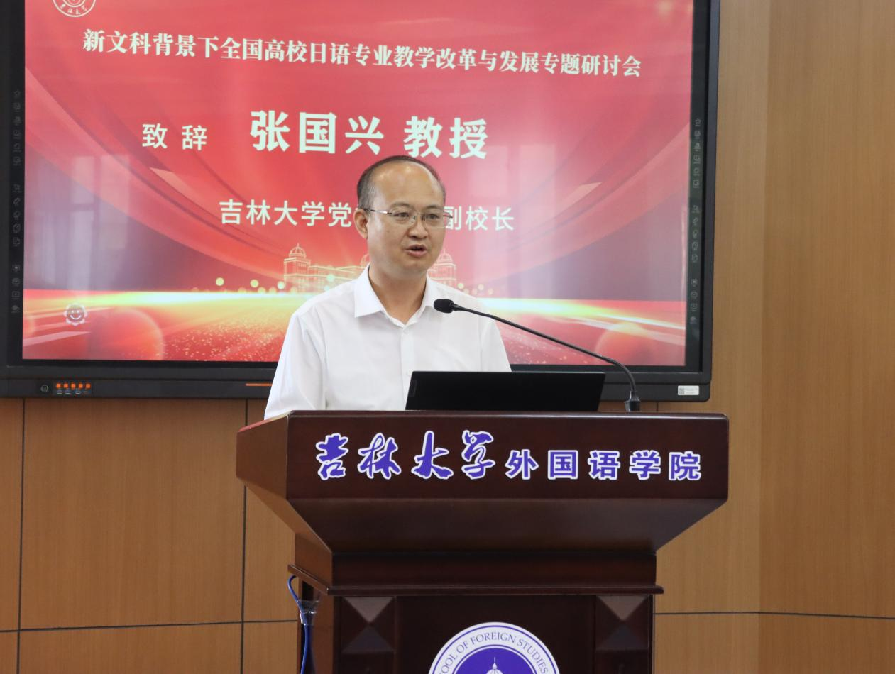 党委常委、副校长张国兴教授,教育部高等学校外国语言文学类专业教学指导委员会日语分委会主任委员、中国日语教学研究会名誉会长、天津外国语大学原校长修刚教授,教育部高等学校外国语言文学类专业教学指导委员会日语分委会委员、中国日语教学研究会会长、广东外语外贸大学东方学研究院院长、广东外语外贸大学日语语言文化学院名誉院长陈多友教授,上海外语教育出版社副社长叶青先生在开幕式上致辞。