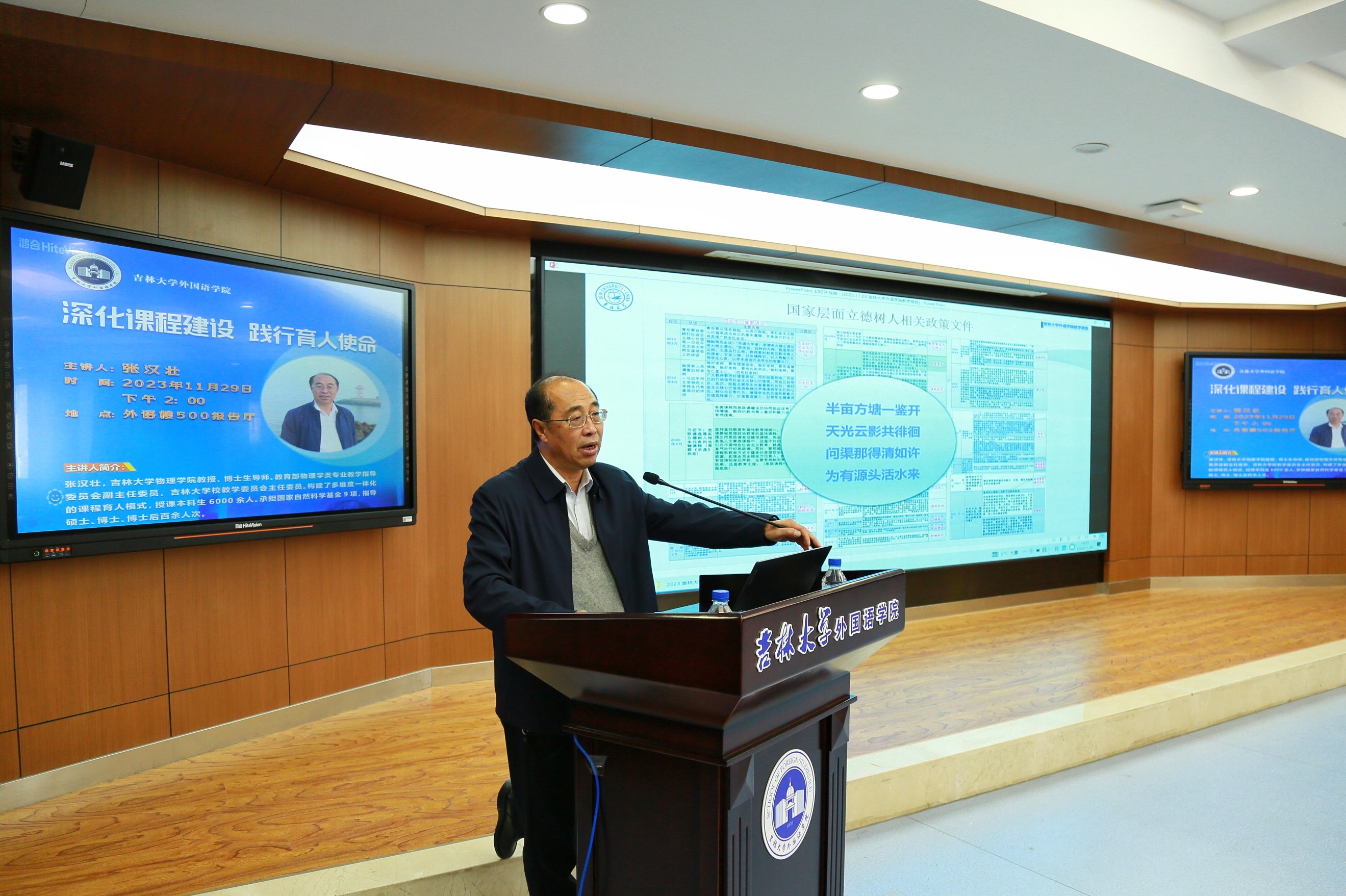 课程建设水平,促进教学创新与教学方法改革,2023年11月29日,张汉壮教授接受学院邀请以“深化课程建设,践行育人使命”为题作报告。张汉壮教授为国家“万人计划”教学名师,“全国五一劳动奖章”“全国杰出教学奖”“宝钢优秀教师特等奖”获得者,是《力学》《物理与人类生活》《物理学导论》《电的产生与传输原理虚拟伪真实验》四门国家级线上一流课程负责人。